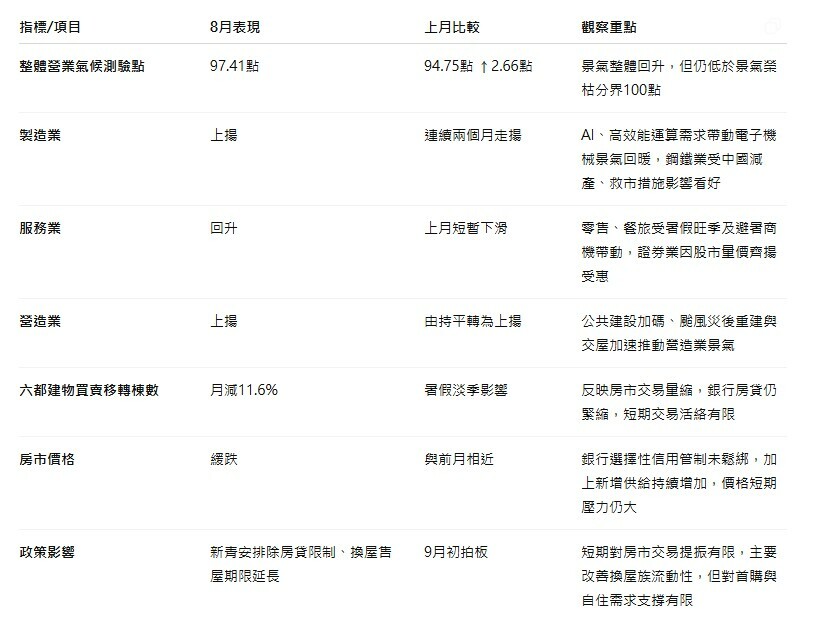 不過劉佩真提醒,房市短期仍受多重因素壓制,包括銀行房貸審慎態度、美國關稅及匯率影響、以及新增供給增加,交易量難有明顯起色,價格也可能呈緩跌態勢。2025年8月整體營業氣候測驗點上升至97.41點,比7月的94.75點上揚2.66點,顯示產業景氣雖有改善,但房市回暖仍需時間與政策配合。